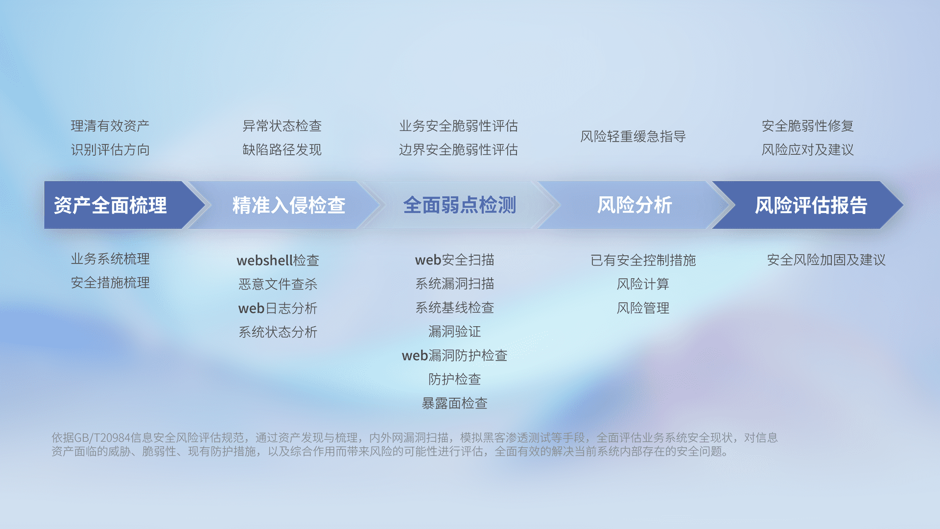 针对客户行业特性,,,,以专业的安全服务+多厂商联合解决方案提供专属的一站式安全管理服务,,帮助客户全面感知网络空间威胁,,基于识别、、、检测、、分析、、、、防护、、、、监测、、、、响应的服务理论模型,,从方案咨询、、、、集成交付、、、评估验证、、优化加固、、、、运维运营,,致力于为客户提供完整的闭环管理式安全服务。。。以实战经验为客户打造高抵御风险的安全体系,,,,帮助客户发现威胁、、、对抗威胁、、、处置威胁,,,,不断积累安全对抗能力,,,,持续保障数字化安全。。。。